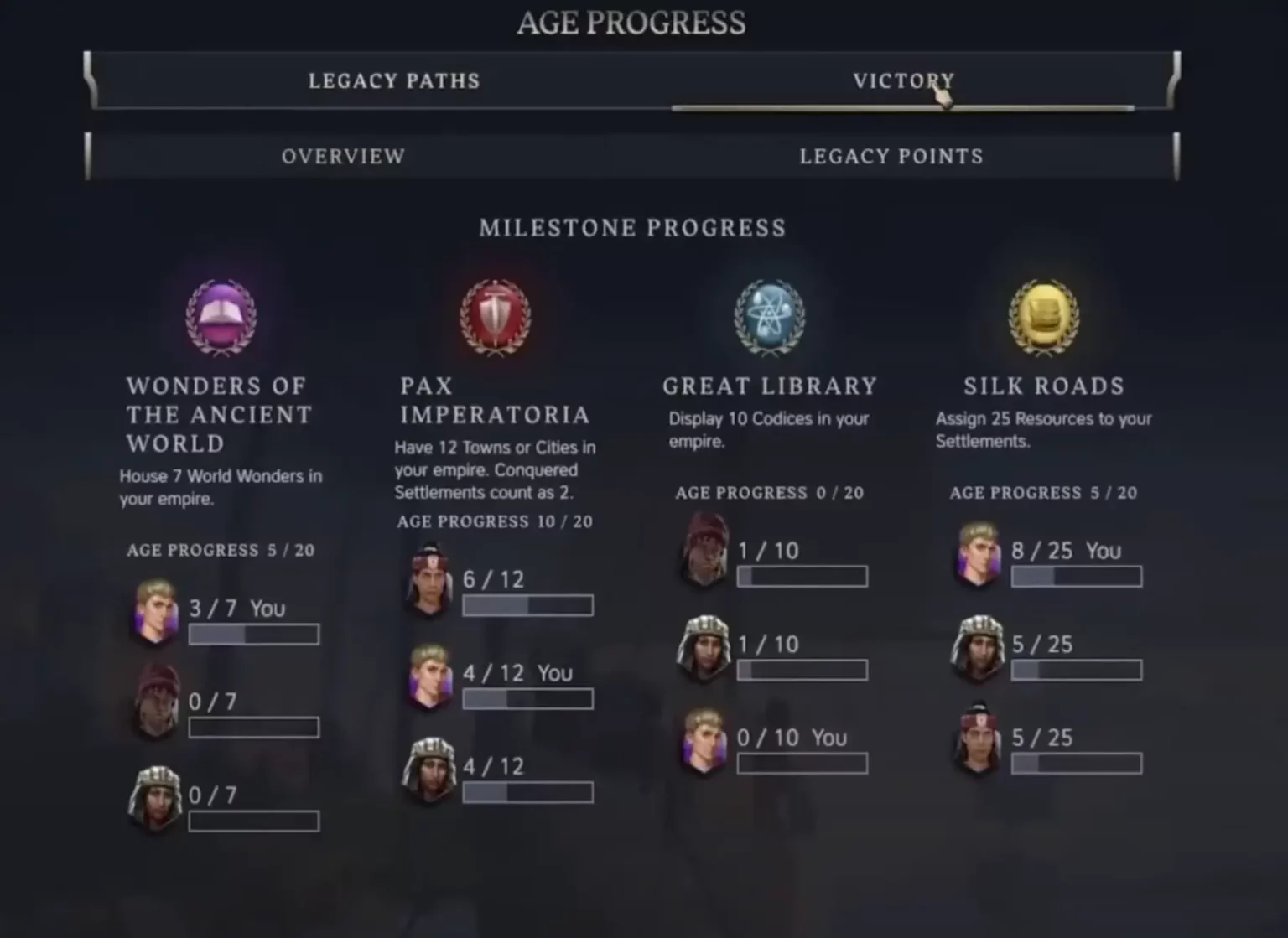 - Military Legacy Path: Achieve milestones through battles and settlements conquests. Aggressive expansion through establishing new settlements or conquest